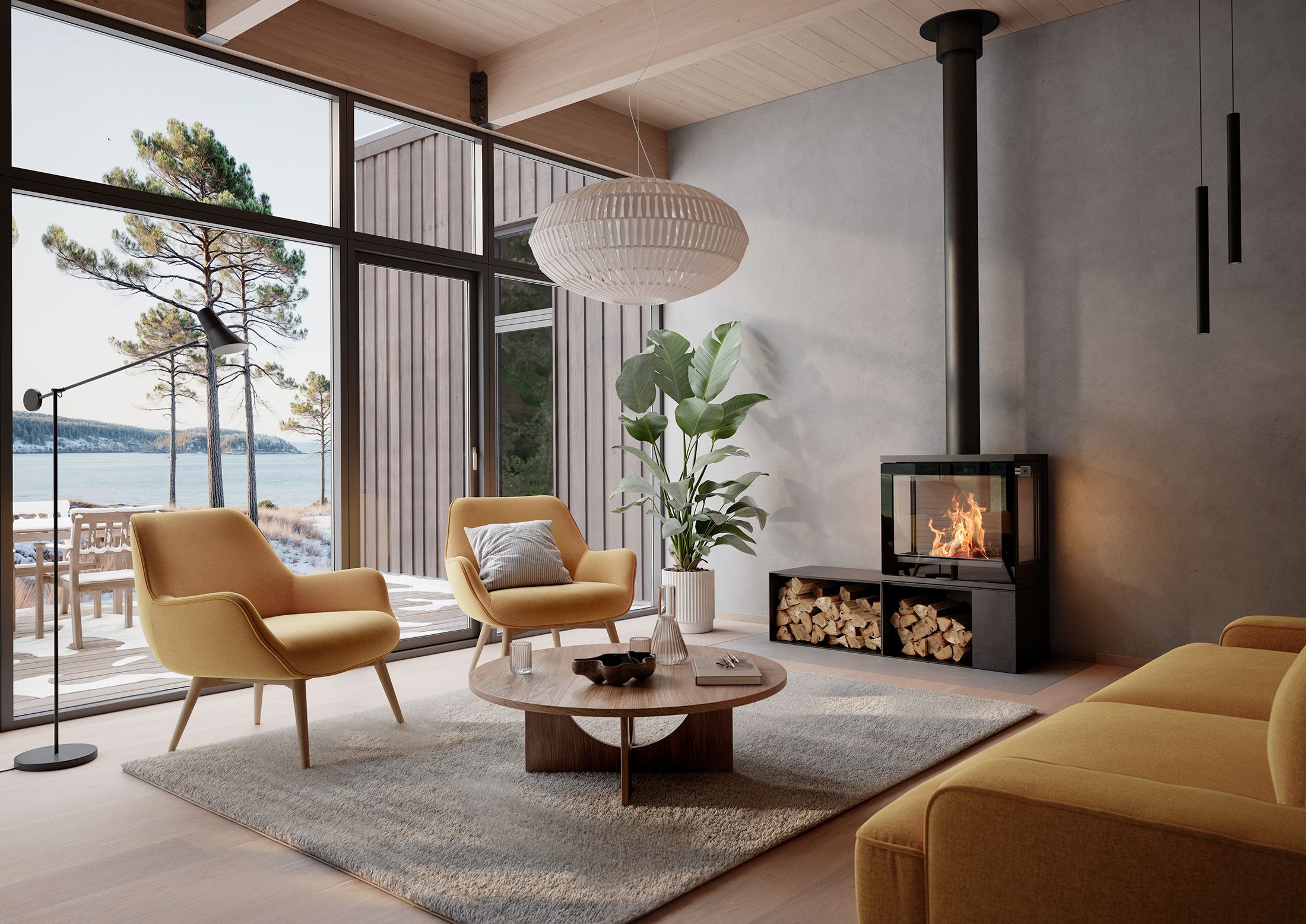 De vlammen worden geaccentueerd door de grote glazen deur. De kachel kan worden gepersonaliseerd met verschillende kleuren, handgrepen en zijglas. Op die manier passen zowel esthetiek als functionaliteit bij de algemene stijl van het huis.