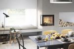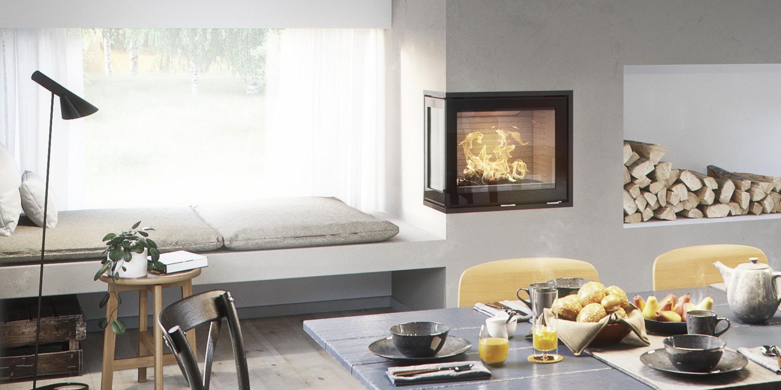 RAIS 600-2 har to store glassflater som gir følelsen av et åpent ildsted. Velg mellom høyre- eller venstrevendt modell som passer perfekt til innbygging i et hjørne.